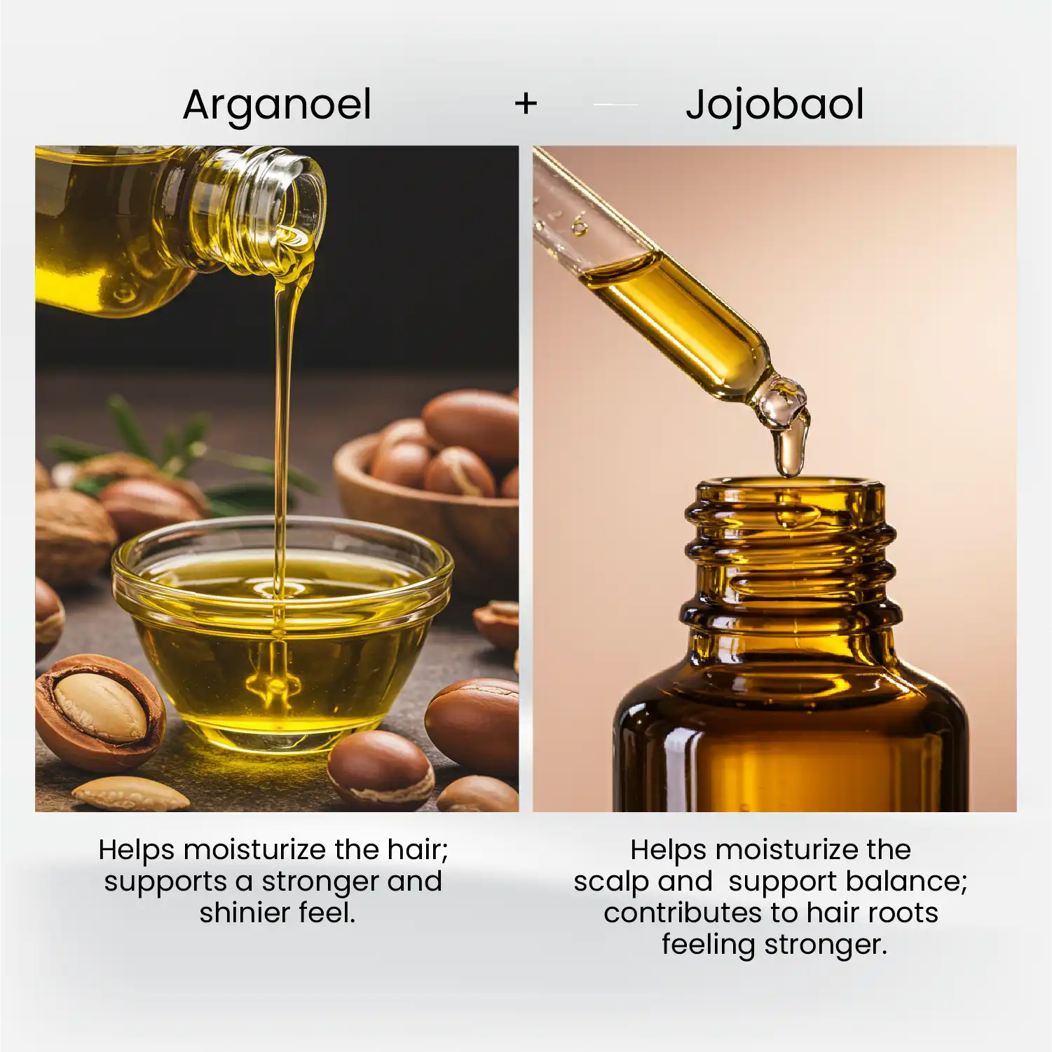 Argan oil is rich in essential fatty acids, antioxidants, carotenoids, and vitamins A, C, and E. These components are known for their ability to help nourish and moisturize the hair, support the strength of hair strands, and help maintain the natural shine and vitality of hair. Vitamin E is included for its role in supporting scalp comfort, while antioxidants help protect hair from environmental factors. Argan oil is also used in hair care routines to help maintain color in dyed hair.