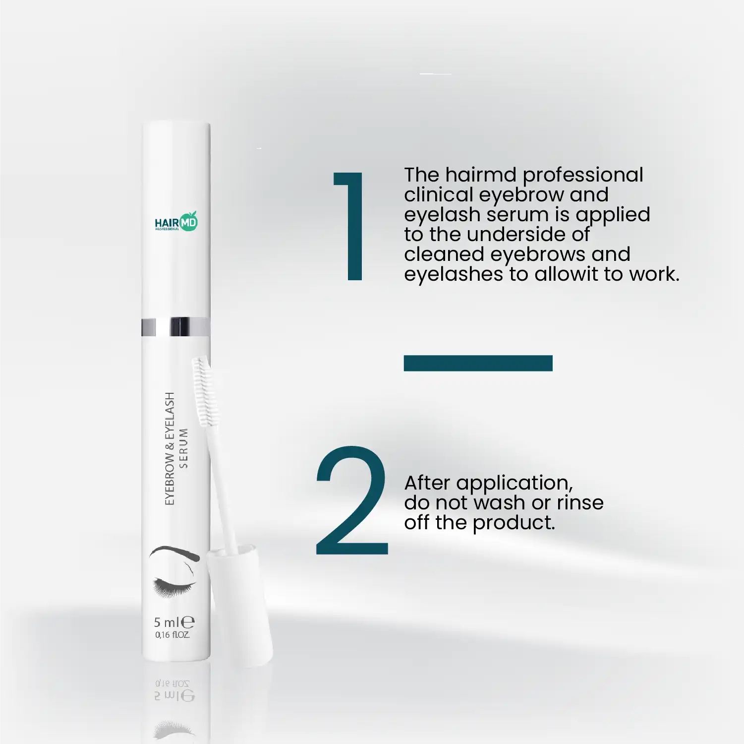 HairMD Professional Clinical Eyebrow and Eyelash Serum is applied to the base of clean eyebrows and eyelashes.