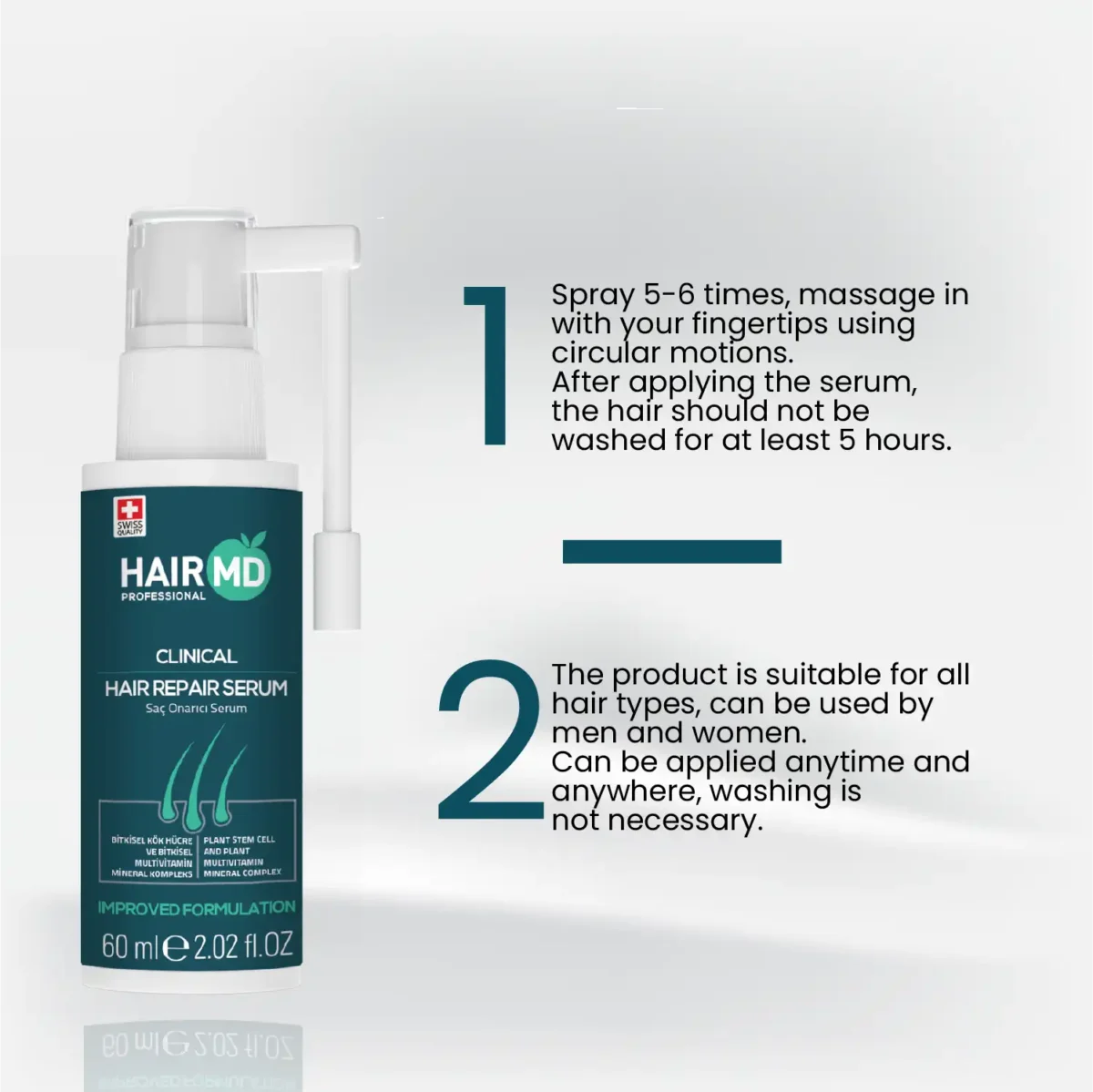 HairMD Professional Clinical Hair Repair Serum is formulated to help support hair and scalp comfort. To apply, spray the serum from a close distance by parting the hair to ensure it reaches the scalp.