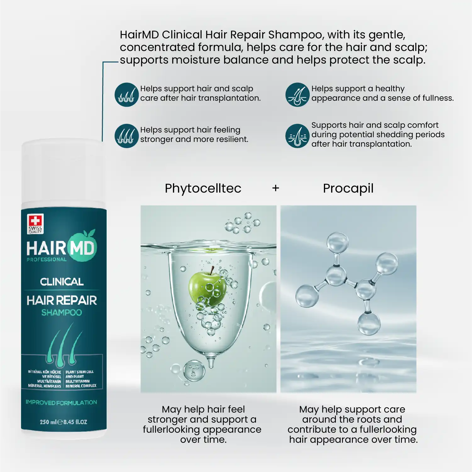 HairMD Clinical Repair Shampoo is formulated to support the healthy functioning of the process after the hair transplantation.